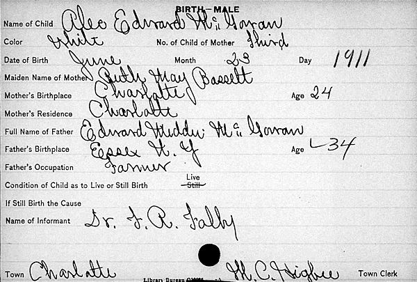 Birth Born on June 23, 1911 in Charlotte, Chittenden Co., VT Death Died on November 19, 1990 in Brockton, Plymouth Co., MA Buried in Massachusetts National Cemetery in Bourne, Barnstable Co., MA Marriages TURNER, Muriel Louise Married on November 19, 1965 in Massachusetts, USA Notes Military Service: WW2 US Army Sources Massachusetts Deaths: #048895 Images Alec McGowan Birth Alec & Muriel (Turner) McGowan