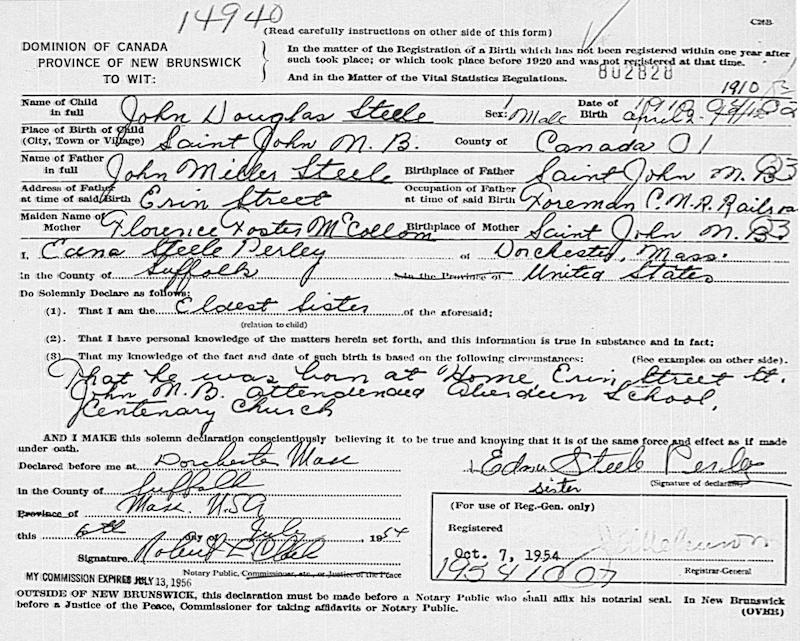 Parents Father: STEELE, John Miller Mother: McCOLLOM, Florence Foster Birth Born on April 02, 1910 in Saint John, Saint John Co., NB Marriages HOSFORD, Dora Margaret Married on June 05, 1941 in Norton, Kings Co., NB Notes Occupation: Brass Moulder Images John D. Steele Birth John D. Steele Marriage
