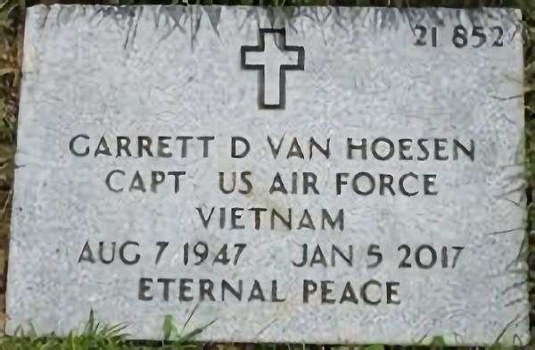 Parents Father: VAN HOESEN, Walter Hamilton Mother: RYDER, Jean Fonda Birth Born on August 07, 1947 in Plainfield, Union Co., NJ Death Died on January 05, 2017 in Hershey, Dauphin Co., PA Buried in Indiantown Gap National Cemetery in Annville, Lebanon Co., PA Marriages NEWMAN, Patricia Diane (Thompson) Married on May 28, 1971 in Santa Barbara Co., CA RICH, Sharon E. (Knouse) Children VAN HOESEN, Nowell N.: November 10, 1969 VAN HOESEN, Aubre A.: April 29, 1973 Notes Occupation: Employee at Science Applications International Corp/ Associate Professor HACC for online courses Military Service: Vietnam USAF Captain Obituary: Garrett D. Van Hoesen, 69, of Palmyra, PA passed away Thursday, January 5, 2017 in the M. S. Hershey Medical Center. Born August 7, 1947 in Plainfield, New Jersey, he was a son of the late Walter and Jean (Ryder) Van Hoesen and was also preceded in death by a brother Joel Van Hoesen. Retired from Science Applications International Corporation, he was an Associate Professor at HACC for online courses, a member of Salem United Church of Christ, Campbelltown, PA and a U. S. Air Force veteran of the Vietnam War. He was an accomplished Dramatic Tenor and Baritone, sang with Voices of the Valley, and formerly sang with Bach Society of Dayton. A Nantucket Basket weaver, he was active with Therapy Dogs International, and liked to travel and golf. Most importantly, he was a devoted and caring husband and father. Surviving are his wife Sharon E. (Knouse) Van Hoesen; children Nowell Van Hoesen (Christa), Aubre Van Hoesen and Lindsay Hoke; siblings Jan Van Hoesen (Karen), Pieter Van Hoesen (Nancy) and Kathryn Bredlau (Paul); seven grandchildren; and two great grandchildren. A memorial service will be held 11:00 AM Thursday, January 12, 2017 at his church, 2761 Horseshoe Pike, Campbelltown, PA, preceded by a visitation beginning at 10:00 AM. Interment, with military honors, will be in Indiantown Gap National Cemetery, Annville, PA. In lieu of flowers, contributions may be made to Therapy Dogs International, 88 Bartley Road, Flanders, NJ 07836 or the Humane Society, 150 North Ramona Road, Myerstown, PA 17067 or Campbelltown Fire Company, 2818 Horseshoe Pike, Palmyra, PA 17078. Share condolences at BuseFuneralHome.com. Dayton Daily News Dayton,OH January 8, 2017 Sources Newspaper Obituary: Dayton Daily News Dayton,OH January 8, 2017 Images Garrett Van Hoesen
