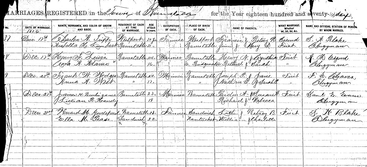 Birth Born on September 06, 1857 in Cotuit, Barnstable Co., MA Death Died on 1929 in Barnstable, Barnstable Co., MA Buried in Mosswood Cemetery in Cotuit, Barnstable Co., MA Marriages BURLINGAME, James H. Married on December 27, 1876 in Barnstable, Barnstable Co., MA Children BURLINGAME, Laura R.: December 10, 1878 - May 19, 1927 BURLINGAME, Ella F. H.: August 07, 1881 - 1929 BURLINGAME, Carlton Austin: June 26, 1884 - February 17, 1943 BURLINGAME, Boy: November 06, 1885 BURLINGAME, James Harold: November 03, 1886 - 1941 BURLINGAME, Joseph S. Hallett: June 17, 1888 - 1950 BURLINGAME, Forrest M.: June 30, 1890 - 1936 BURLINGAME, George Carpenter: October 10, 1892 - 1948 Sources Massachusetts Cemeteries: Mosswood Cemetery Cotuit,MA Images James & Lillian (Handy) Burlingame James Burlingame Marriage