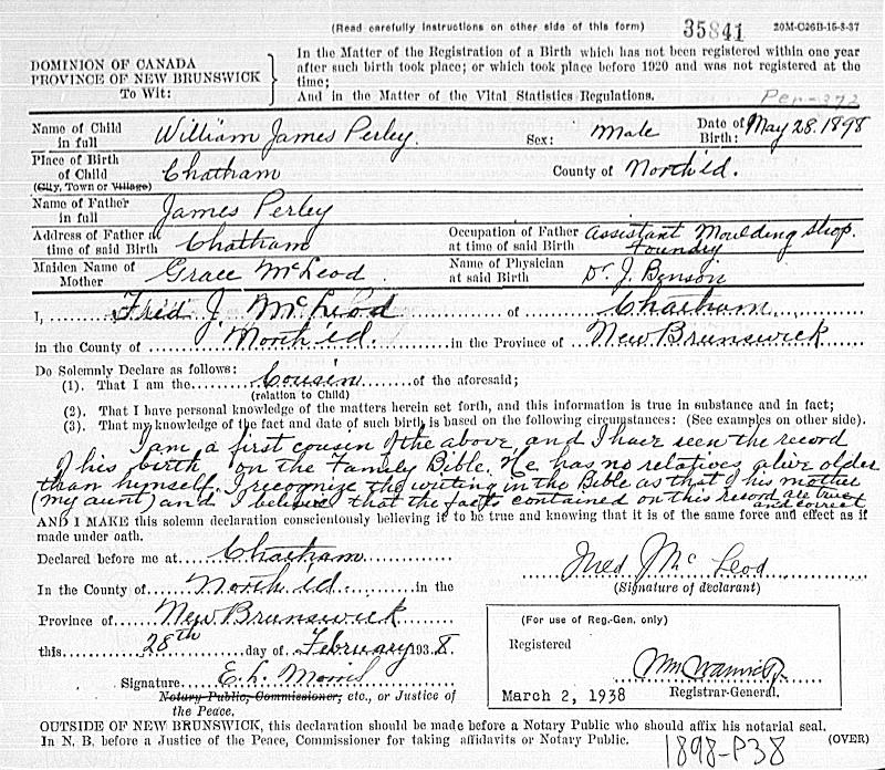 Birth Born on May 28, 1898 in Chatham, Northumberland Co., NB Death Died on August 13, 1979 in Cambridge, Middlesex Co., MA Buried in Ridgelawn Cemetery in Watertown, Middlesex Co., MA Marriages STEELE, Edna May Married on February 01, 1930 in Watertown, Middlesex Co., MA Children PERLEY, Dorothy A.: December 18, 1935 - January 17, 2021 PERLEY, Ruth F.: February 17, 1942 Notes Occupation: Automobile Mechanic Sources Massachusetts Deaths: #038897 Images Wilbur Perley Birth Wilbur & Edna (Steele) Perley