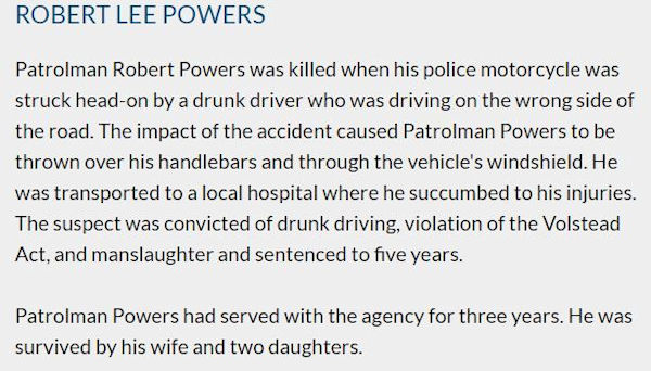 Birth Born on August 26, 1897 in Minneapolis, Hennepin Co., MN Death Died on June 16, 1928 in Oswego, Labette Co., KS Buried in Mount Hope Cemetery in Oswego, Labette Co., KS Marriages CARTER, Ruth Floretta Married on December 22, 1919 in El Centro, Imperial Co., CA Children POWERS, Robertta Lee: December 16, 1920 - March 29, 1990 POWERS, Flora Lee: January 29, 1929 - October 15, 1989 Notes Military Service: WW1 US Army Occupation: Police Officer Death: His police motorcycle was hit by a drunk driver. Sources Newspaper Obituary: San Diego Union San Diego,CA Obituary June 20,1928 Images Robert Powers Ruth F. Carter Marriage Robert Powers Obit Robert Powers1 Robert powers