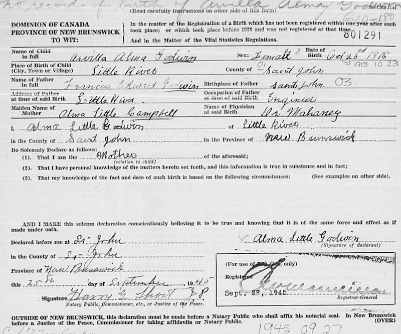 Birth Born on October 23, 1918 in Little River, Saint John Co., NB Death Died on November 28, 1984 in Saint John, Saint John Co., NB Buried in Fernhill Cemetery in Saint John, Saint John Co., NB Marriages STEELE, Harold Eugene Married on June 12, 1940 in Saint John, Saint John Co., NB Children STEELE, Carolyn STEELE, Gary STEELE, Donna Noreen: November 04, 1941 - January 10, 2022 STEELE, Barbara Lynn: July 09, 1946 STEELE, Harold James Frederick: April 28, 1954 - August 13, 2013 Notes Occupation: Maid Sources Mormons: https://www.familysearch.org/en/tree/person/details/LR4B-JYV Images Arvilla Godwin Birth Harold Steele Marriage Arvilla Godwin