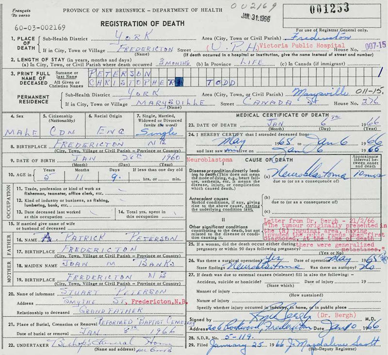 Parents Father: PETERSON, Aldon Patrick Mother: BANKS, Joan Marina Birth Born on January 28, 1960 in Fredericton, York Co., NB Death Died on January 06, 1966 in Fredericton, York Co., NB Buried in Olivet Cemetery in Marysville, York Co., NB Notes Death: Neuroblastoma Sources NB Deaths: #1253 Images Christopher Peterson Christopher Peterson Death