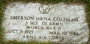 Parents Father: COLEMAN, William Alonzo Mother: BURLINGAME, Effie Louise Birth Born on October 05, 1925 in Woonsocket, Providence Co., RI Death Died on March 10, 1984 in Barnstable, Barnstable Co., MA Buried in Mosswood Cemetery in Cotuit, Barnstable Co., MA Notes Occupation: Refrigerator Serviceman Military Service: WW2 US Army Air Fprce Sergeant Sources Massachusetts Deaths: #020215 Images Emerson Coleman