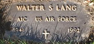 Parents Father: LANG, Walter Franklin Mother: PHINNEY, Jewell F. Birth Born on February 26, 1941 in Danvers, Essex Co., MA Death Died on November 16, 1992 in Beverly, Essex Co., MA Buried in Saint Mary's Cemetery in Salem, Essex Co., MA Marriages , Judith A. Notes Military Service: USAF Sources Massachusetts Deaths: #050921 Images Walter S. & Judith Lang Walter S. Lang