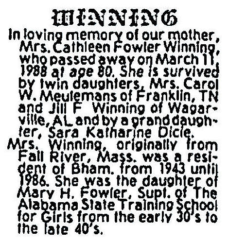 Parents Father: FOWLER, James Fenwick Mother: HART, Mary V. Birth Born on February 15, 1908 in Fall River, Bristol Co., MA Death Died on March 11, 1988 in Wagarville, Washington Co., AL Buried in Elmwood Cemetery in Birmingham, Jefferson Co., AL Marriages WINNING, James Married on 1943 Children WINNING, Jill Fowler: November 03, 1944 - July 12, 1993 WINNING, Carol: November 03, 1944 Notes Occupation: Superintendant of Alabama State Training School for Girls/ Physiotherapist Images Cathleen Fowler Birth Cathleen (Fowler) Winning Cathleen (Fowler) Winning Obit