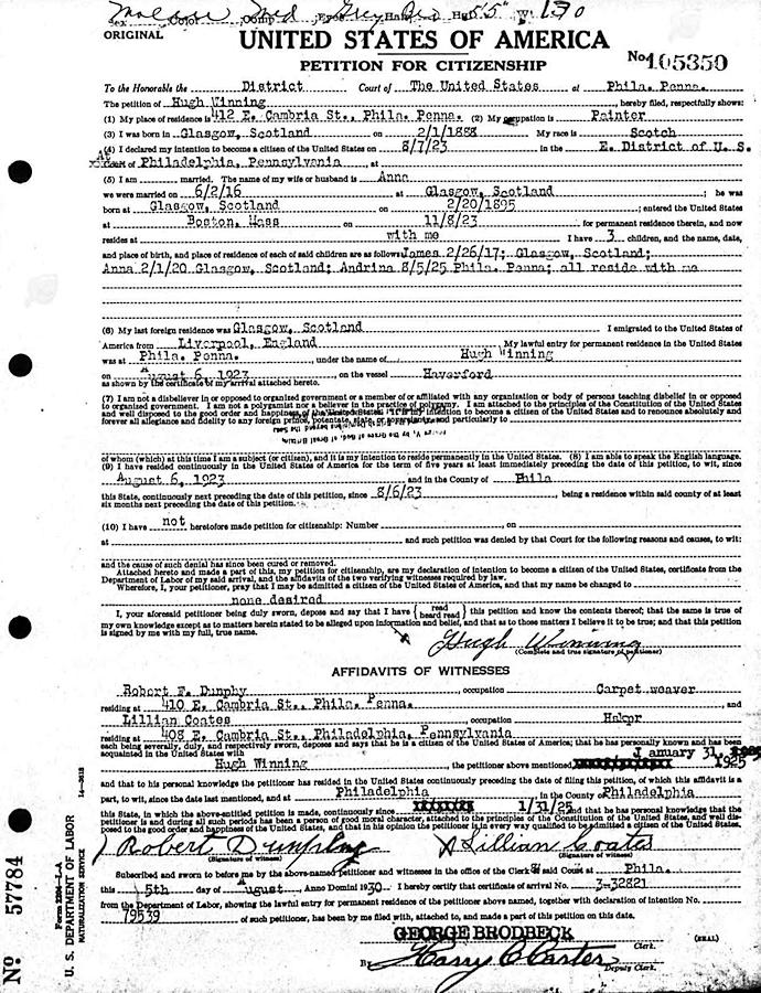 Birth Born on February 26, 1917 in Glasgow, Lanarkshire, Scotland Death Died on May 14, 2008 in Huntsville, Madison Co., AL Buried in Hampton Cove Cemetery in Owens Cross Roads, Madison Co., AL Marriages FOWLER, Cathleen Anna Married on 1943 Children WINNING, Jill Fowler: November 03, 1944 - July 12, 1993 WINNING, Carol: November 03, 1944 Notes Military Service: WW2, Korea US Army Colonel Occupation: Military Strategist Army Missile Command Obituary: Retired Col. James "Jim" Winning, 91, of Huntsville passed away Wednesday. A native of Glasgow, Scotland, Jim arrived in America at age six with a tiny band of Scots, traveling on the Megantic, sister ship of the Titanic. Jim retired in 1972 from his civilian position with the Army Missile Command as a military strategist. He had served with pride in the U.S. Army and Alabama National Guard for over 30 years, commanding the 1169th Engineering Group in his final post, and having fought in distant islands in the Pacific during World War II and in Korea. He often opined that there was no mission that the United States Army could not do. Jim was a leader of men, always upright and honorable, and a beloved husband, father, and grandfather. He was preceded in death by a daughter, Jill Winning, and his parents, Hugh and Anna MacLachlan Winning. Survivors include his wife, Mary Catherine Winning; son, James Clements Winning and wife Lauren of Annapolis, Md.; daughters, Constance Winning Aguda and husband Salvador of Winter Springs, Fla., Stephanie Werdehoff and husband Bill of Huntsville; Carol MacLachlan of Nashville, and Joy Pickett and husband Pete of Athens; and four grandchildren. Images James Winning Military Pension Application James Winning Naturalization