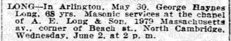 Birth Born on January 20, 1852 in Bear River, Annapolis Co., NS Death Died on May 30, 1920 in Arlington, Middlesex Co., MA Buried in Mount Pleasant Cemetery in Arlington, Middlesex Co., MA Marriages DURLING, Florence May Married on May 10, 1894 in Cambridge, Middlesex Co., MA Children LONG, Adna George: February 24, 1895 - December 25, 1961 LONG, Gladys M.: December 02, 1896 - January 17, 1985 LONG, Harold Martin: May 09, 1899 - February 18, 1956 LONG, Ella: May 10, 1899 LONG, Melvin Freeman: April 25, 1901 - 1966 Notes Occupation: Carpenter Death: Mitral Regurgitation Sources Massachusetts Deaths: Arlington Pg. 360 #147 Images George & Florence (Durland) Long & Harold & Doshie (Wood) Long George Long Death Florence Durling Marriage George Long Obit The Boston Globe Boston,MA Jun 1,1920