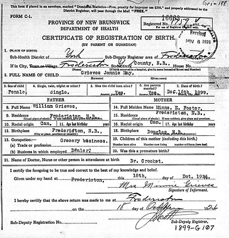 Parents Father: GRIEVES, William N. Mother: FOSTER, Mary Elizabeth Birth Born on December 15, 1899 in Fredericton, York Co., NB Notes Occupation: Bank Cashier Images Jennie Grieves Birth
