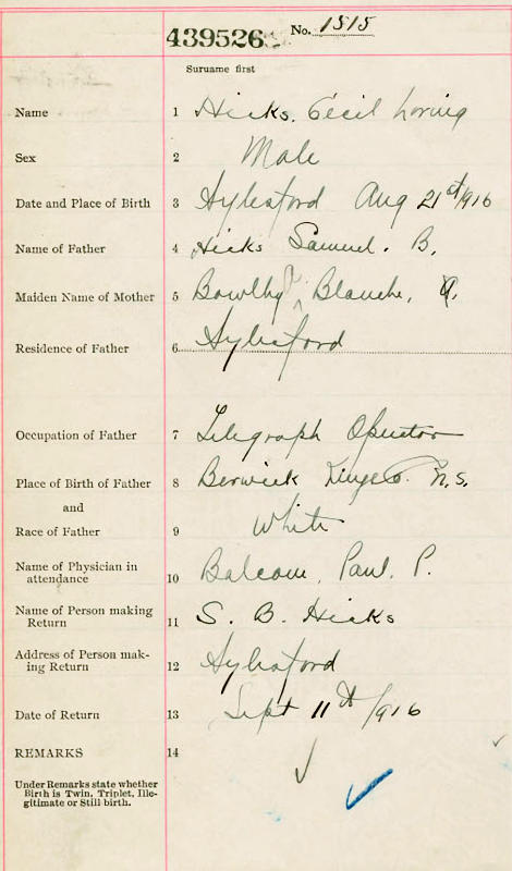 Parents Father: HICKS, Samuel Burpee Mother: BOWLBY, Ada Blanche Birth Born on August 21, 1916 in Aylesford, Kings Co., NS Death Died on May 12, 2005 in Carring Place, Hastings Co., ON Buried in Stockdale Cemetery in Stockdale, Northumberland Co., ON Marriages NUGENT, Helen Clute Married on August 17, 1951 in Quinte West, Hastings Co., ON WEBBER, Thelma Meribelle Married on November 11, 1939 in Scarsdale, Lunenburg Co., NS Divorced in 1950 Children HICKS, Marilyn HICKS, Peter Erik: May 25, 1954 HICKS, Nancy Ann: July 16, 1958 HICKS, Susan Jane: July 16, 1958 Notes Occupation: Farmer Military Service: RCAF Sources Mormons: https://www.familysearch.org/en/tree/person/details/GZ4K-9D9?completedMergeDuplicateId=GXG5-Z7W Images Cecil Hicks Birth Cecil & Helen (Nugent) Hicks Cecil Hicks Marriage