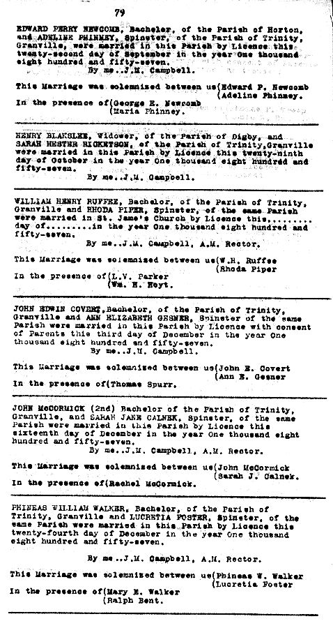 Parents Father: WALKER, William S. Mother: PHINNEY, Ann Birth Born on February 16, 1826 in Granville, Annapolis Co., NS Death Died on January 06, 1906 in Annapolis Co., NS Buried in Wadeville Cemetery in Granville Centre, Annapolis Co., NS Marriages FOSTER, Lucretia Married on December 24, 1857 in Granville, Annapolis Co., NS Children WALKER, Mary: 1867 Notes Occupation: Farmer Sources Annapolis Cemetery Records: Wadeville Cemetery Granville Centre,NS Images William Walker and Children Birth Phineas Walker Marriage