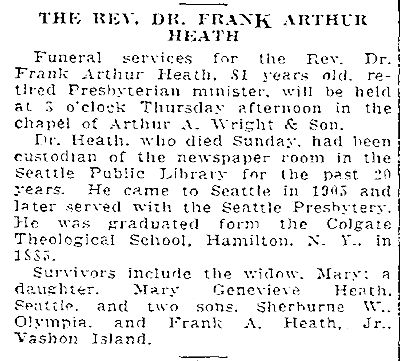 Birth Born on March 20, 1860 in Charlestown, Suffolk Co., MA Death Died on January 25, 1942 in Seattle, King Co., WA Buried in Cremation Marriages WALKER, May J. Married on September 20, 1887 in Boston, Suffolk Co., MA Children HEATH, Mary Genevieve: April 25, 1888 - March 25, 1969 HEATH, Sherburne Walker: November 03, 1889 - April 29, 1960 HEATH, Frank Arthur: 1898 Notes Occupation: Clergyman - Presbyterian Death: Carcinoma of Stomach Sources Washington Deaths: #375 Images Frank Heath Birth Frank Heath Death May Walker Marriage Frank Heath Obit Seattle Daily Times 1942-01-27