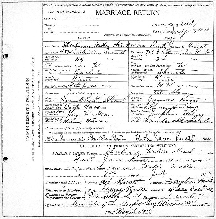 Parents Father: HEATH, Frank Arthur Mother: WALKER, May J. Birth Born on November 03, 1889 in Acton, Middlesex Co., MA Death Died on April 29, 1960 in Olympia, Thurston Co., WA Buried in Odd Fellows Memorial Park and Mausoleum in Olympia, Thurston Co., WA Marriages KNOTT, Ruth Jane Married on July 08, 1919 in Walla Walla, Walla Walla Co., WA Children HEATH, Sherburne Walker: May 03, 1920 - September 28, 2011 HEATH, James Howard: July 19, 1927 Notes Occupation: Salesman/ Florist Death: Fibroscarcoma Military Service: WW1 US Army Sources Washington Deaths: #9070 Images Sherburne Heath Birth Sherburne & Ruth (Knott) Heath Sherburne Heath Death Sherburne Heath Marriage