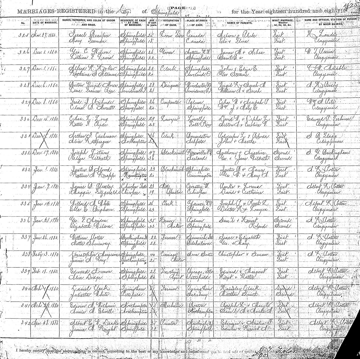Parents Father: MARGESON, Christopher Mother: DODGE, Susannah Birth Born on September 17, 1839 in Wilmot, Annapolis Co., NS Death Died on March 17, 1919 in Springfield, Hampden Co., MA Buried in Springfield Cemetery in Springfield, Hampden Co., MA Marriages KING, Alice Jennie Married on February 03, 1880 in Springfield, Hampden Co., MA Children MARGESON, Albert Norton: November 25, 1884 - October 12, 1948 MARGESON, Ansley K.: November 01, 1888 MARGESON, Marion Gertrude: June 11, 1894 - March 17, 1958 Notes Occupation: Carriage Maker Death: Valvular Heart Disease Sources Massachusetts Deaths: Springfield Pg. 238 #575 Images Christopher Jr & Alice (King) Margeson,Willie & Marion (Margeson) Norris Christopher Margeson Death Christopher Margeson Marriage