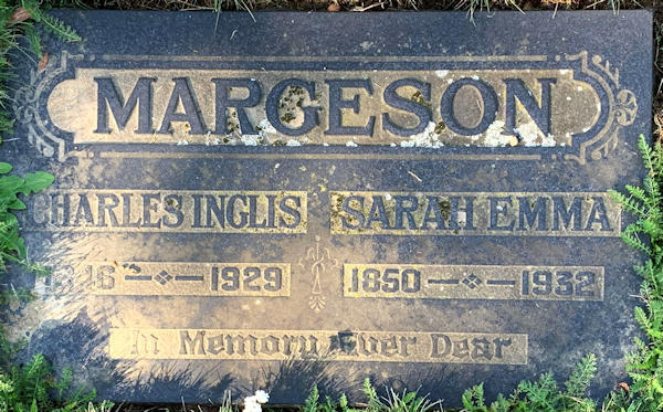 Birth Born on October 27, 1850 in Aylesford, Kings Co., NS Death Died on December 26, 1932 in Vancouver, Metro Vancouver Region, BC Buried in Ocean View Burial Park in Burnaby, Metro Vancouver Region, BC Marriages MARGESON, Charles Inglis Married on October 19, 1870 in Aylesford, Kings Co., NS Children MARGESON, Eva Van Arsdel: October 30, 1872 - February 11, 1944 MARGESON, Wylie Churchill: February 25, 1875 - August 31, 1933 MARGESON, Harry Burton: October 13, 1880 - April 09, 1978 MARGESON, Karl Andrew: May 27, 1884 - August 15, 1953 MARGESON, Paul Eve: February 02, 1892 - 1972 Sources BC Deaths: 1932-09-472626 Images Charles I. & Emma (Robinson) Margeson. Charles I. Margeson Marriage Emma (Robinson) Margeson Obit Emma Robinson