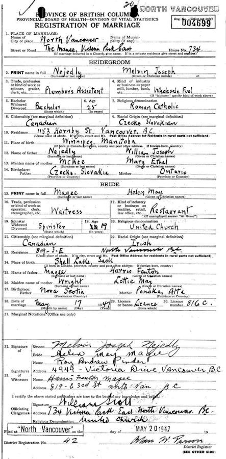 Parents Father: MAGEE, Harris Fenton Mother: WRIGHT, Lottie May Birth Born on June 25, 1927 in Shell Lake, North Battleford Census Division, SK Death Died on December 29, 1997 in New Westminister, Metro Vancouver Region, BC Buried in Cremation Marriages NEJEDLY, Melvin Joseph Married on May 17, 1947 in North Vancouver, Metro Vancouver Region, BC Children NEJEDLY, Robert M. NEJEDLY, Sherry NEJEDLY, Gay NEJEDLY, Mark NEJEDLY, Patricia Mary: August 26, 1952 - June 22, 2019 Notes Occupation: Waitress/ Retail Clerk Death: Cardiac Shock Sources BC Deaths: #97-026296 Images Helen (Magee) Nejedly Death1 Helen (Magee) Nejedly Death Helen Magee Marriage Helen (Magee) Nejedly Obit