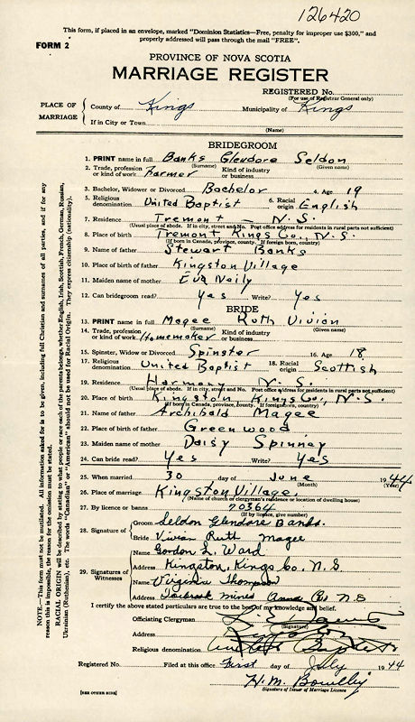 Parents Father: MAGEE, Archibald Scott Mother: SPINNEY, Daisy Pearl Birth Born on June 06, 1926 in Kingston, Kings Co., NS Death Died on July 06, 1967 in Tremont Kings Co., NS Buried in Tremont New Cemetery in Tremont Kings Co., NS Marriages BANKS, Seldon Glendon Married on June 30, 1944 in Kingston, Kings Co., NS Children BANKS, Linda BANKS, Blair BANKS, Kenneth BANKS, Stephen BANKS, Guy BANKS, Susan Pearl: 1956 - April 15, 1985 Notes Death: Cerebral Astrocytoma Obituary: Mrs. Seldon Banks, 41, died at her home in Tremont. Born at Kingston, she was a daughter of Archibald and Daisy Magee. Besides her husband she is survived by four sons and two daughters Blair, Kenneth, Stephen, Guy and Susan at home and Linda (Mrs. Stephen Miller), of St. Thomas, Ont., also one brother Blake Magee, Ontario. Funeral was held from the Tremont Baptist Church conducted by Rev. Howard McCormick with interment in the Tremont cemetery. Chronicle Herald Halifax,NS July 19,1967 Sources Nova Scotia Deaths: Year 1967 #4419 Images Seldon & Vivian (Magee) Banks Ruth (Magee) Banks Death Vivian Magee Marriage