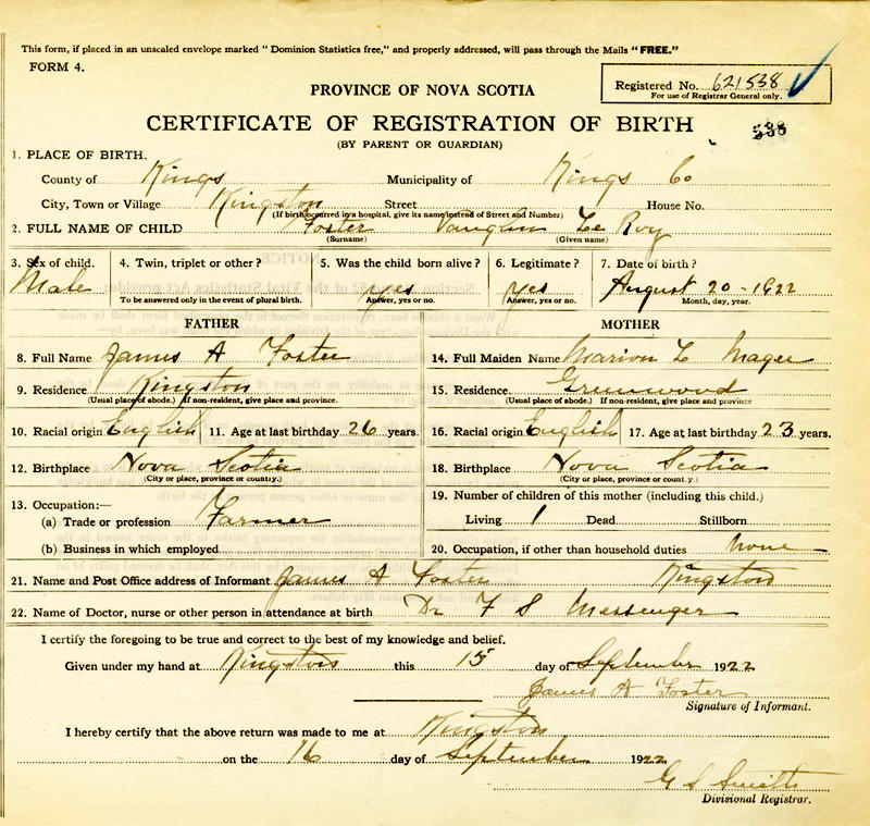 Parents Father: FOSTER, James Archibald Mother: MAGEE, Marion Levenia Birth Born on August 20, 1922 in Kingston, Kings Co., NB Death Died on September 16, 1948 Buried in North Kingston Cemetery in North Kingston, Kings Co., NS Notes Military Service: WW2 RCAF Sources Kings Cemetery Records: North Kingston Cemetery North Kingston,NS Images Vaughn Foster Birth Vaughn Foster