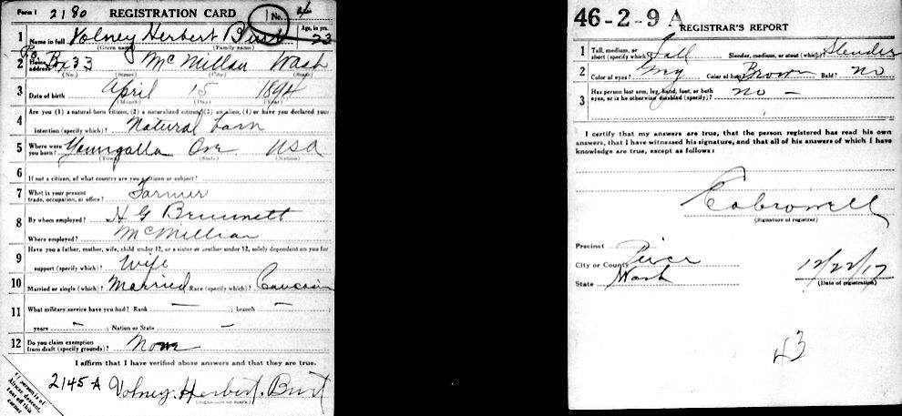 Birth Born on April 15, 1894 in Yoncalla, Douglas Co., OR Death Died on September 22, 1942 in Everett, Snohomish Co., WA Buried in Evergreen Cemetery in Everett, Snohomish Co., WA Marriages WEATHERBIE, Linda May Married on November 14, 1917 in Vancouver, Metro Vancouver Region, BC Notes Occupation: Farmer/ Showman/ Fuel Dealer Military Service: WW1 USMC Death: Fascial Space Infection Sources Washington Deaths: #313 Images Volney Burt Death Volney Burt WW1 Draft Linda Weatherbie Marriage Volney Burt Military Service