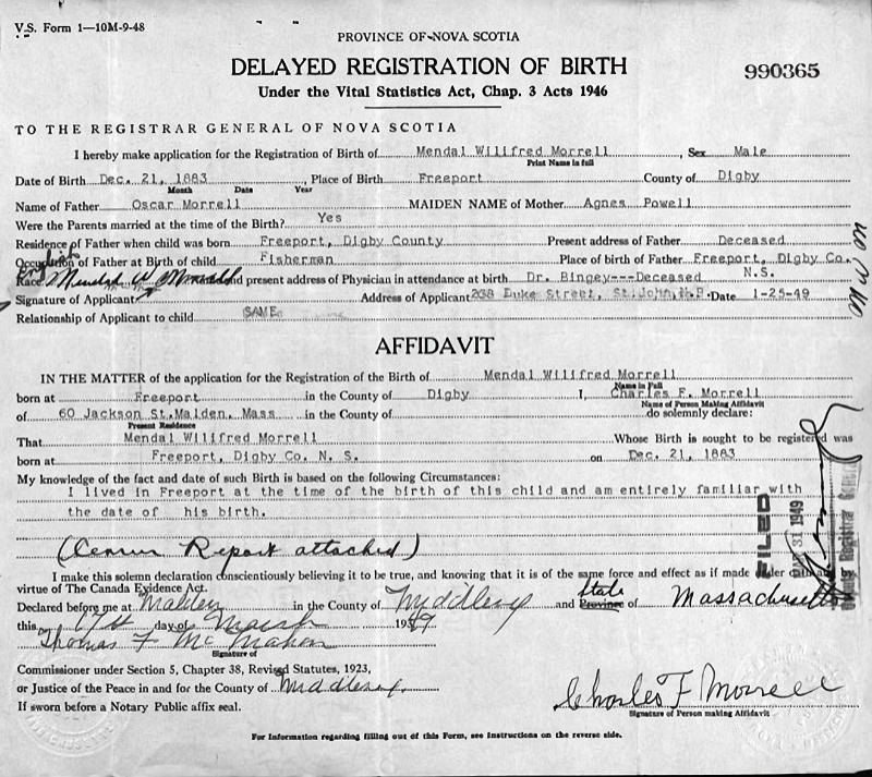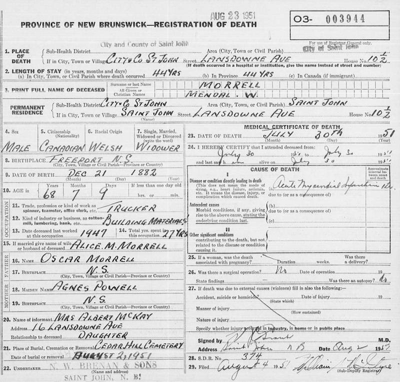 Birth Born on December 21, 1883 in Freeport, Digby Co., NS Death Died on July 30, 1951 in Saint John, Saint John Co., NB Buried in Fernhill Cemetery in Saint John, Saint John Co., NB Marriages McCOLLOM, Alice May Married on April 03, 1908 in Saint John, Saint John Co., NB Children MORRELL, Hazel Gertrude: November 12, 1908 MORRELL, Agnes May: May 22, 1911 MORRELL, Mildred Foster Bernice: June 06, 1914 Notes Occupation: Mariner/ Dredging/ Trucker Death: Acute Myocardial Infarction Sources Nova Scotia Deaths: #3944 Images Mendal Morrell Birth Mendal Morrell Death Alice McCollom Marriage