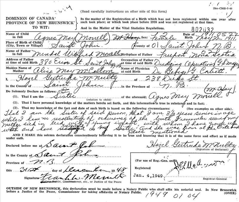 Parents Father: MORRELL, Mendal Willfred Mother: McCOLLOM, Alice May Birth Born on May 22, 1911 in Saint John, Saint John Co., NB Marriages CROWLEY, William Maurice Married on June 22, 1968 in Saint John, Saint John Co., NB McKAY, Albert George Married on January 09, 1939 in Saint John, Saint John Co., NB Children McKAY, Brenda Colleen: April 08, 1947 - October 10, 2007 Notes Occupation: Laundress Images Agnes Morrell Birth Agnes Morrell Marriage Agnes (Morrell) McKay Marriage
