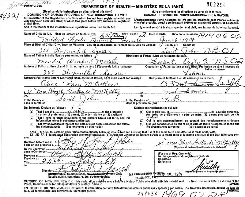 Parents Father: MORRELL, Mendal Willfred Mother: McCOLLOM, Alice May Birth Born on June 06, 1914 in Saint John, Saint John Co., NB Marriages FARRIS, Gordon Frederick Married on May 04, 1934 in Saint John, Saint John Co., NB Images Mildred Morrell Birth Mildred Morrell Marriage