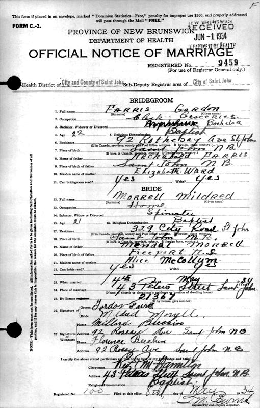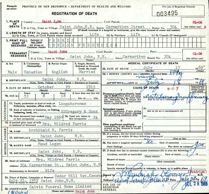 Birth Born on October 29, 1915 in Saint John, Saint John Co., NB Death Died on July 17, 1969 in Saint John, Saint John Co., NB Buried in Cedar Hill Extension Cemetery in Saint John, Saint John Co., NB Marriages MORRELL, Mildred Foster Bernice Married on May 04, 1934 in Saint John, Saint John Co., NB Notes Occupation: Grocery Store Clerk/ Longshoreman Military Service: WW2 RC Army Death: Acute Coronary Insuffienciency Sources NB Deaths: #3495 Images Gordon Farris Birth Gordon Farris Gordon Farris Death Mildred Morrell Marriage Gordon Farris Obit