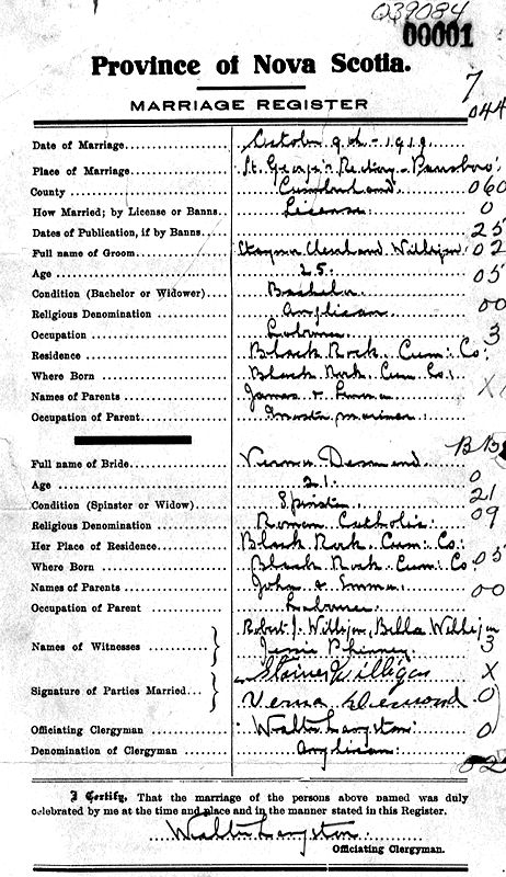 Parents Father: DESMOND, John Mother: PHINNEY, Emma Frances Birth Born on February 10, 1898 in Black Rock, Cumberland Co., NS Death Died on December 04, 1963 in Parrsboro, Cumberland Co., NS Buried in Christ Church Anglican Cemetery in West Bay, Cumberland Co., NS Marriages WILLIGAR, Stainer Cleveland Married on October 09, 1919 in Parrsboro, Cumberland Co., NS Notes Death: Chronic Myocarditis/ Pneumonia Sources Nova Scotia Deaths: Year 1963 Pg. 6832 Images Verna Desmond Birth Verna (Desmond) Willigar Death Stainer Willigar Marriage