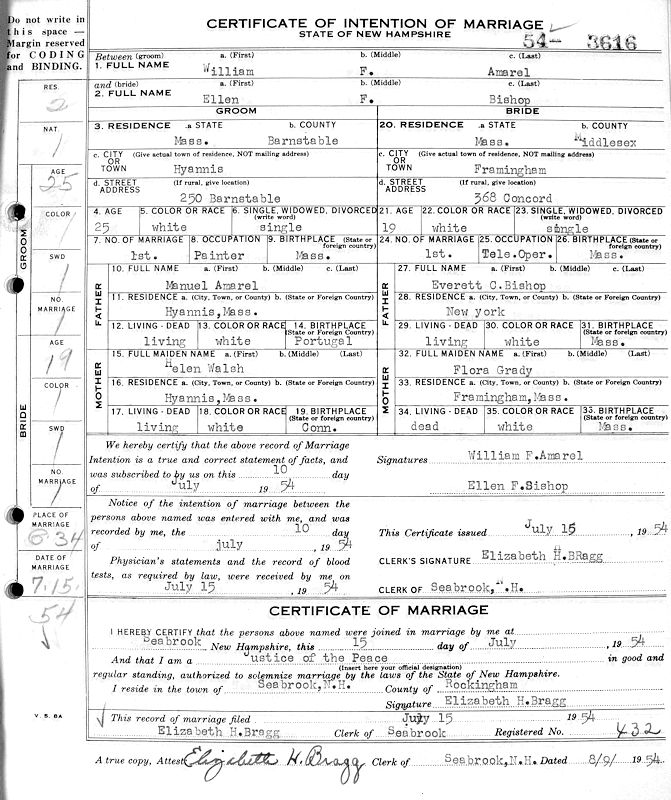 Birth Born on April 13, 1928 in Centerville, Barnstable Co., MA Death Died on April 02, 2020 in Hyannis, Barnstable Co., MA Marriages BISHOP, Ellen Flora Married on July 15, 1954 in Seabrook, Rockingham Co., NH Notes Occupation: Painter Sources Mormons: https://www.familysearch.org/tree/person/details/GZW4-MSC Images Ellen Bishop Marriage