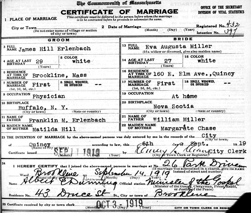 Parents Father: MILLER, Harris Michael Mother: CHASE, Lunette V. Birth Born on August 14, 1892 in Clarence, Annapolis Co., NS Death Died on September 03, 1966 in San Francisco, San Francisco Co., CA Buried in Sacramento City Cemetery in Sacramento, Sacramento Co., CA Marriages ERLENBACH, James Hill Married on September 14, 1919 in Brookline, Norfolk Co., MA Children ERLENBACH, James Hill: May 16, 1921 - October 09, 2007 Notes Occupation: Nurse Military Service: WW1 US Army Nurse Corps Images Eva Miller Birth Eva (Miller) Erlenbach Eva Miller Marriage Eva Miller Military Service