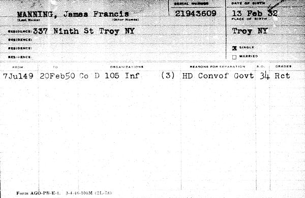 Parents Father: MANNING, James Francis Mother: FLYNN, Kathryn M. Birth Born on February 13, 1932 in Troy, Rensslaer Co., NY Notes Military Service: New York National Guard Images James F. Manning Jr Military Service