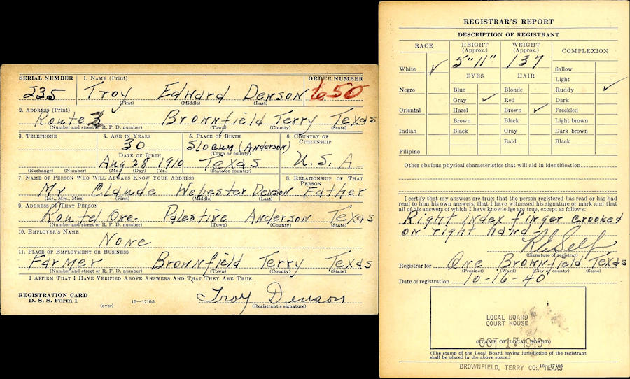 Birth Born on August 28, 1910 in Slocum, Anderson Co., TX Death Died on August 22, 2000 in Liberty, Liberty Co., TX Buried in Farley Chapel Cemetery in Shepard, San Jacinto Co., TX Marriages HOOPER, Minnie Eloise Children DENSON, Charles Ray: May 02, 1949 Notes Occupation: Farm Labourer Military Service: WW2 US Army Images Troy Denson Birth Troy Denson Troy Denson WW2 Draft