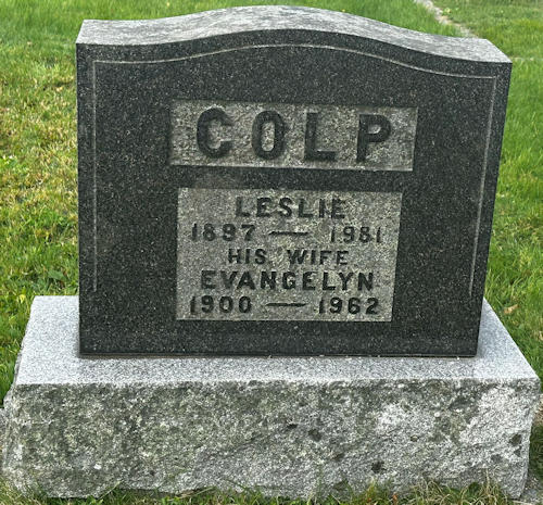 Birth Born on July 05, 1897 in Port Mouton, Queens Co., NS Death Died on 1981 in Truro, Colchester Co., NS Buried in Peaceful Hill Cemetery in Port Mouton, Queens Co., NS Marriages DODGE, Evangelyne Stinson Married on April 13, 1925 in Truro, Colchester Co., NS Notes Occupation: Automobile Mechanic Sources Findagrave.com: https://www.findagrave.com/memorial/261079988/leslie-colp Images Leslie Colp Birth Leslie & Evangelyne (Dodge) Colp Evangelyne Dodge Marriage Leslie Colp Obit