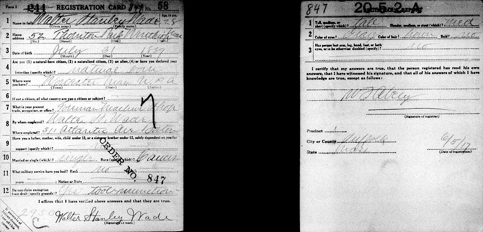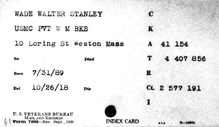 Birth Born on July 31, 1889 in Worcester, Worcester Co., MA Death Died on 1980 in Rindge, Cheshire Co., NH Marriages SAFFORD, Sylvia Married on July 20, 1944 in Brattleboro, Windham Co., VT Notes Occupation: Machinist/ General Manager of Machine Shop Military Service: WW1 US Marine Corp Images Walter Wade Birth Sylvia Safford Marriage Walter Wade Military Service Walter Wade WW1 Draft Walter Wade WW2 Draft