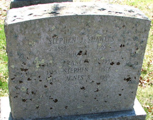 Birth Born on January 10, 1915 in Boston, Suffolk Co., MA Death Died on December 11, 1978 in Weymouth, Norfolk Co., MA Buried in Hanover Center Cemetery in Hanover, Plymouth Co., MA Marriages CAMERON, Agnes Ritchie Children SHAWLES, Carol J.: February 12, 1943 SHAWLES, Donna: February 28, 1948 Notes Occupation: Melter Brass Foundry/ Iron Moulder Iron Foundry Sources Massachusetts Deaths: #053479 Images Stephen Shawles Birth Stephen & Agnes (Cameron) Shawles