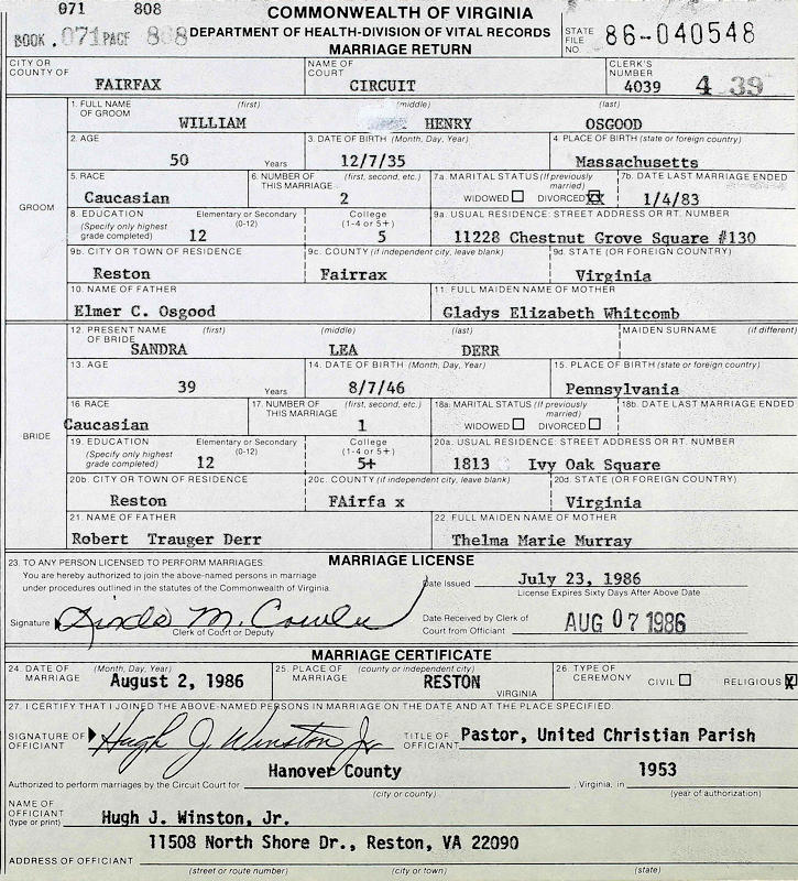 Parents Father: OSGOOD, Elmer Clayton Mother: WHITCOMB, Gladys Elizabeth Birth Born on December 07, 1935 in Greenfield, Franklin Co., MA Death Died on May 05, 2003 in Arlington, Arlington Co., VA Buried in Watsontown Cemetery in Watsontown, Northumberland Co., PA Marriages DERR, Sandra Lea Married on August 02, 1986 in Reston, Fairfax Co., VA GASKILL, Carolyn D. Married on September 13, 1959 in Raleigh, Wake Co., NC Divorced in 1983 Children OSGOOD, Daniel F. OSGOOD, Sharon Sources US Social Security Index: Numerical ID Files Images William & Sandra (Derr) Osgood William Osgood Marriage2 William Osgood Marriage