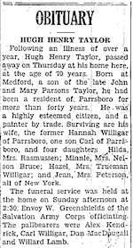 Parents Father: TAYLOR, John Mother: PARSONS, Mary Matilda Birth Born on August 21, 1868 in Medford, Kings Co., NS Death Died on December 29, 1938 in Parrsboro, Cumberland Co., NS Buried in Crossroads Cemetery in Parrsboro, Cumberland Co., NS Marriages WILLIGAR, Hannah Mary Married on November 10, 1891 in Parrsboro, Cumberland Co., NS Children TAYLOR, Hilda Agatha: February 01, 1894 - May 02, 1960 TAYLOR, Roland Clyde: May 12, 1896 - June 16, 1936 TAYLOR, Minnie Baker: March 25, 1898 - December 14, 1974 TAYLOR, Susanne L.: November 24, 1900 - January 01, 1919 TAYLOR, Carl Hugh: November 14, 1903 - October 15, 1972 TAYLOR, Hazel Mary: August 04, 1906 - June 14, 1986 TAYLOR, Eugenia Grace: July 27, 1908 - November 18, 1987 TAYLOR, Signe: March 20, 1910 - 1911 Notes Occupation: Mariner/ Painter Death: Carcinoma of Prostate Sources Nova Scotia Deaths: Book 167 Pg. 1275 Images Hugh Taylor Birth Hugh & Hannah (Willigar) Taylor,Children Susanne & Signe Taylor Hugh Taylor Death Hannah Willigar Marriage Hugh Taylor Obit Hannah (Willigar) & Hugh Taylor