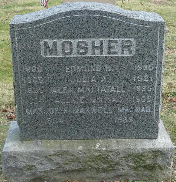 Birth Born on April 27, 1860 in Halifax, Halifax Regional Municipality, NS Death Died on January 23, 1935 in Medford, Middlesex Co., MA Buried in Cedar Grove Cemetery in Dorchester, Suffolk Co., MA Marriages MATTATALL, Julia Anna Married on September 23, 1891 in Newton, Middlesex Co., MA Children MOSHER, Jeanette Maybelle: March 04, 1890 - August 30, 1991 MOSHER, Edith Rosanna: July 18, 1892 - July 31, 1991 MOSHER, Irene Blanche: November 27, 1894 - February 04, 1979 MOSHER, Marjorie Estelle: June 21, 1904 - December 07, 1983 Notes Occupation: Farmer/ Teamster Sources Findagrave.com: https://www.findagrave.com/memorial/261712393/edmund_hezekiah_mosher Images Edmund & Julia (Mattatall) Mosher,Alexander Mattatall,Alexander & Marjorie (Mosher) MacNab Julia Mattatall Marriage