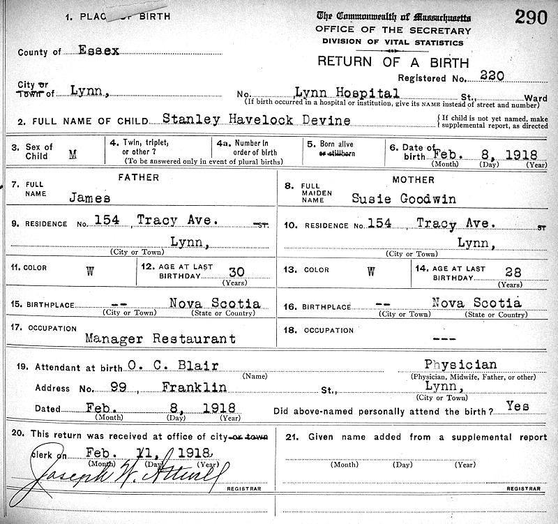 Birth Born on February 08, 1918 in Lynn, Essex Co., MA Marriages LAXTON, Jane Children DEVINE, James H.: 1941 DEVINE, Sally J.: April 10, 1942 DEVINE, Kimberlee Palmer: April 10, 1942 DEVINE, Steven J.: 1945 DEVINE, Scott Palmer: December 22, 1949 Notes Occupation: Restaurant Owner Images Stanley Devine Birth