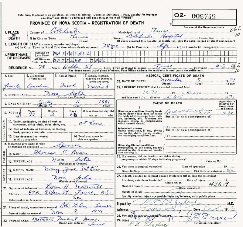 Birth Born on July 11, 1881 in Westchester Valley, Cumberland Co., NS Death Died on November 05, 1971 in Truro, Colchester Co., NS Buried in Robie St. Cemetery in Truro, Colchester Co., NS Marriages MATTATALL, Spencer Luther Married on September 24, 1913 in Westchester, Cumberland Co., NS Children MATTATALL, Marion Agnes: June 25, 1914 - 2002 MATTATALL, Margaret Jean: September 23, 1916 - 2014 MATTATALL, Hilbert Logan: May 04, 1918 - February 25, 1993 MATTATALL, Harriet Leota: November 05, 1922 - 2013 Notes Death: Cerebral Vascular Accident Sources Nova Scotia Deaths: Year 1971 #6748 Images Matilda (O'Brien) Mattatall Death Spencer Mattatall Marriage
