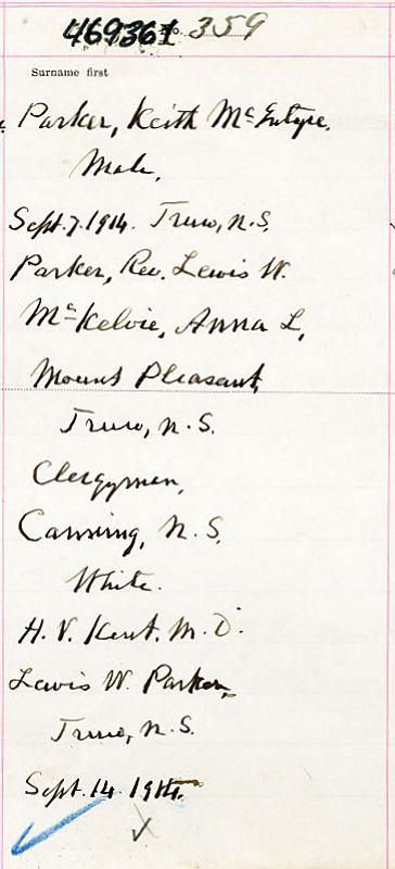 Birth Born on September 07, 1914 in Truro, Colchester Co., NS Death Died on 1982 Buried in Robie St. Cemetery in Truro, Colchester Co., NS Marriages MATTATALL, Margaret Jean Married on August 11, 1943 in Truro, Colchester Co., NS Children PARKER, Alan Lewis MacKelvie: November 11, 1948 - November 16, 1948 Notes Occupation: Teacher Sources Colchester Cemeteries: Robie St. Cemetery Truro,NS Images Keith Parker Birth Keith & Margaret (Mattatall) & Alan Parker Margaret Mattatall Marriage