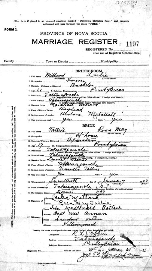 Parents Father: MILLARD, Marshall Mother: MATTATALL, Barbara Elizabeth Birth Born on October 13, 1900 in Tatamagouche, Colchester Co., NS Marriages TATTRIE, Rosa Mae Married on January 17, 1923 in Tatamagouche, Colchester Co., NS Children MILLARD, Florence MILLARD, Betty MILLARD, Edgar - April 06, 2009 MILLARD, Margaret MILLARD, Helena Marion: August 20, 1923 MILLARD, Muriel Isabel: 1925 MILLARD, Sylvia Jean: 1926 MILLARD, Geneva Beryl: September 19, 1928 - July 07, 1972 Notes Occupation: Farmer/ Labourer Images Leslie Millard Marriage