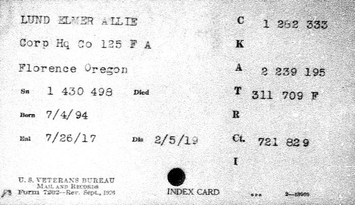 Parents Father: LUND, Joseph Lincoln Mother: MATTATALL, Olive Lillian Birth Born on July 04, 1894 in Anoka, Anoka Co., MN Death Died on March 21, 1980 in Florence, Lane Co., OR Buried in Pacific Sunset Memorial Park Cemetery in Florence, Lane Co., OR Marriages ABBOTT, Angela Lucella Notes Occupation: Clerk, Labourer/ Garage Attendant Military Service: WW1 US A Sources Oregon Deaths: #80-04664 Images Elmer Lund WW1 Draft Elmer Lund WW2 Draft Elmer Lund Military Service