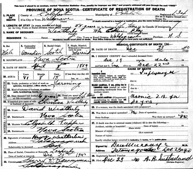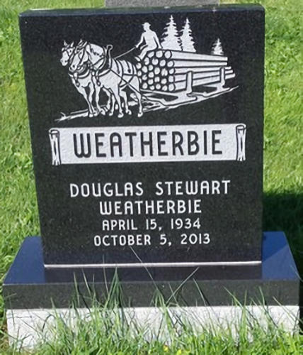 Parents Father: WEATHERBIE, Alexander Douglas Mother: STEWART, Ellie Thelma Birth Born on April 15, 1934 in Tatamagouche, Colchester Co., NS Death Died on October 05, 2013 in Tatamagouche, Colchester Co., NS Buried in Bayview Cemetery in Waldegrave, Colchester Co., NS Sources Colchester Cemeteries: Bayview Cemetery Waldegrave,NS Images Douglas Weatherbie Edwin Weatherby Death Edwin Weatherby Marriage