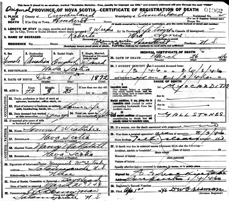 Parents Father: WEATHERBY, Samuel Mother: MATTATALL, Agnes Nancy Birth Born on December 01, 1872 in Tatamagouche, Colchester Co., NS Death Died on March 26, 1946 in Amherst, Cumberland Co., NS Buried in Union Church Cemetery in Bay Head, Colchester Co., NS Marriages ROBERTS, David Married on July 03, 1912 in Pictou, Pictou Co., NS Notes Death: Myocarditis Sources Nova Scotia Deaths: Year 1946 #1962 Images Agnes (Weatherby) Roberts Death Agnes Weatherby Marriage