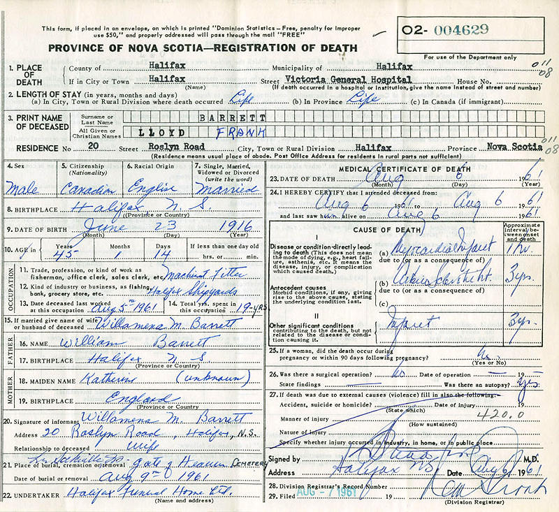 Birth Born on June 23, 1916 in Halifax, Halifax Regional Municipality, NS Death Died on August 06, 1961 in Halifax, Halifax Regional Municipality, NS Buried in Gate of Heaven Cemetery in Lower Sackville, Halifax Co., NS Marriages LEE, Willamena Margaret Married on March 16, 1939 in Halifax, Halifax Regional Municipality, NS Notes Occupation: Hotel Bell Boy/ Machinist Fitter Halifax Shipyards Death: Myocardial Infarction Sources Nova Scotia Deaths: Year 1961 #4629 Images Lloyd & Willamena (Lee) Barrett Lloyd Barrett Death Willimena Lee Marriage