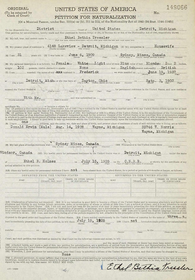 Parents Father: HOLMES, George William Mother: HANCE, Frances Marie Birth Born on June 06, 1909 in Sydney Mines, Cape Breton Co., NS Death Died on January 01, 2000 in Wayne Co., MI Buried in Cremated Marriages BEDELL, Harold Peter Married on April 11, 1945 in Detroit, Wayne Co., MI TRESSLER, Frederick Berk Married on June 19, 1937 in Detroit, Wayne Co., MI PRINCE, Gerald Erwin Married on 1927 in Detroit, Wayne Co., MI Divorced in 1933 Children PRINCE, Donald Erwin: August 14, 1928 - February 16, 2020 BEDELL, Duane Harold: August 02, 1947 - June 22, 2012 Images Ethel Holmes Birth Ethel (Holmes) Tressler Naturalization1 Ethel (Holmes) Tressler Naturalization