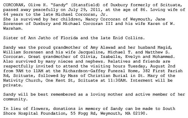 Parents Father: SMITH, Burleigh Martin Howard Mother: MANNING, Florence Benjamin Birth Born on November 22, 1924 in Chester, Lunenburg Co., NS Death Died on July 29, 2011 in Duxbury, Plymouth Co., MA Buried in Massachusetts National Cemetery in Bourne, Barnstable Co., MA Marriages CORCORAN, Michael Children CORCORAN, Nancy Lovett: July 15, 1948 CORCORAN, Jane Elizabeth: July 26, 1951 CORCORAN, Michael: October 26, 1954 Images Michael Jr & Olive (Smith) Corcoran Olive Smith Obit Olive Smith