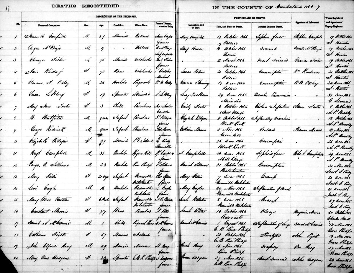 Birth Born on 1839 in Prince Edward Island, Canada Death Died on December 25, 1866 in Black Rock, Cumberland Co., NS Marriages WILLIGAR, Peter Married on June 28, 1865 in Amherst, Cumberland Co., NS Children WILLIGAR, Benjamin Wentworth: March 27, 1866 - October 11, 1866 Notes Death: Consumption Sources Nova Scotia Deaths: Book 1805 Pg. 17 #10 Images Elizabeth (Purdy) Willigar Death Peter Willigar Marriage2